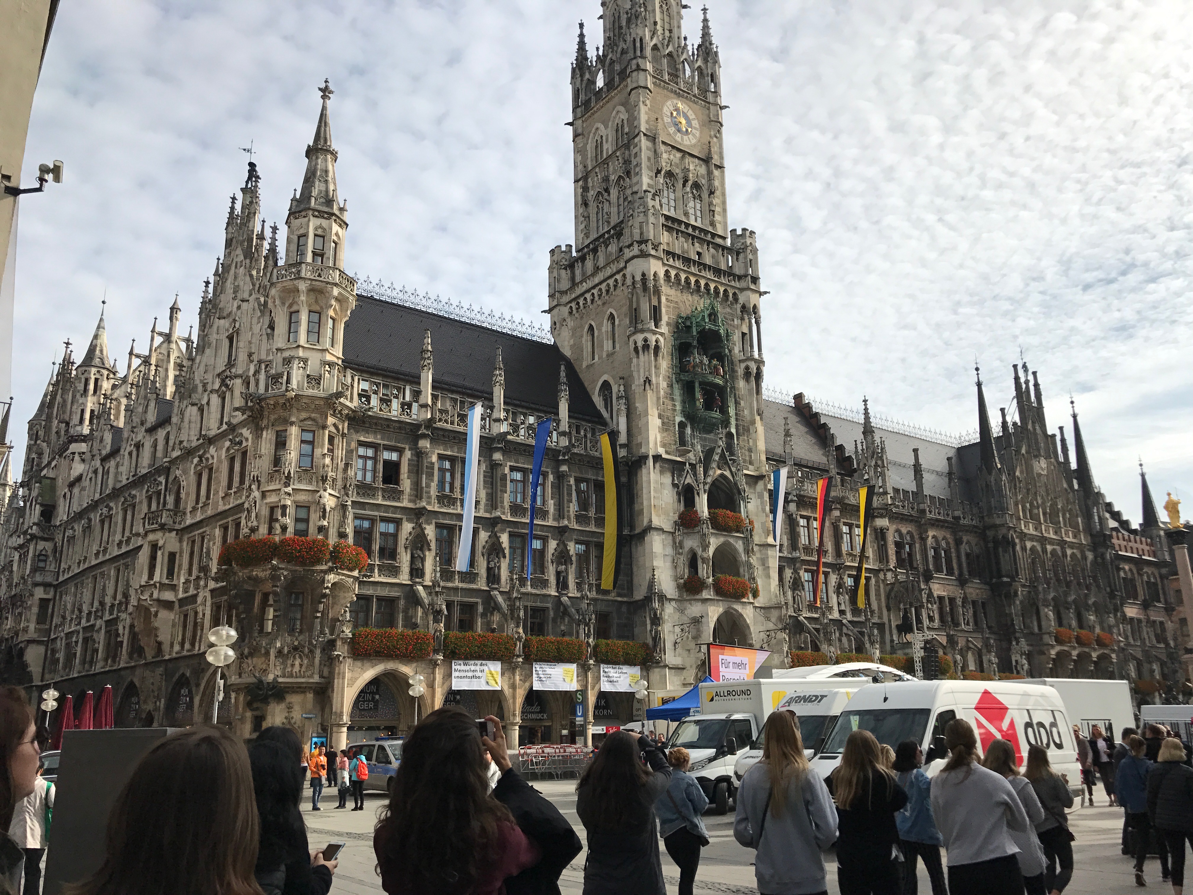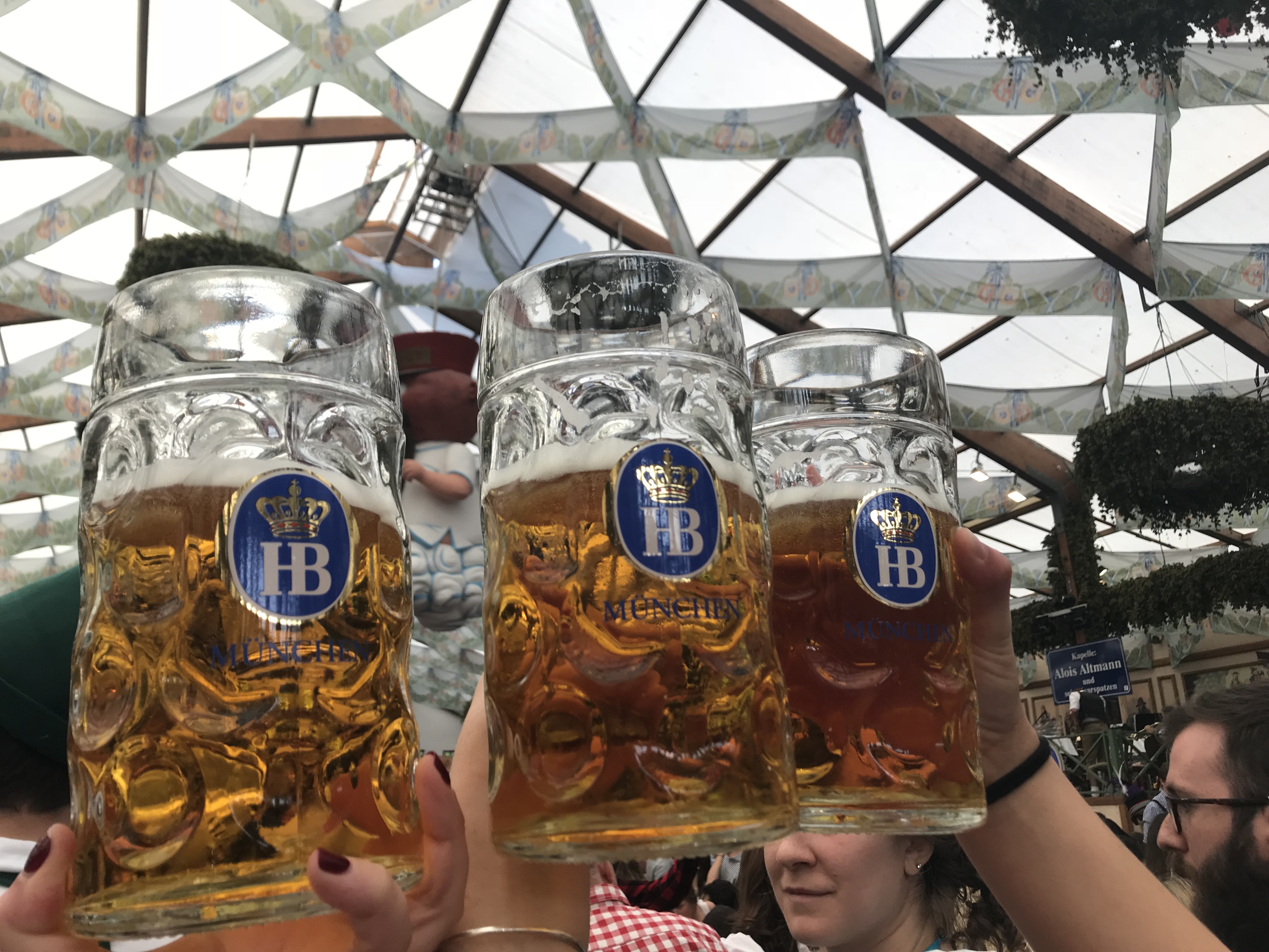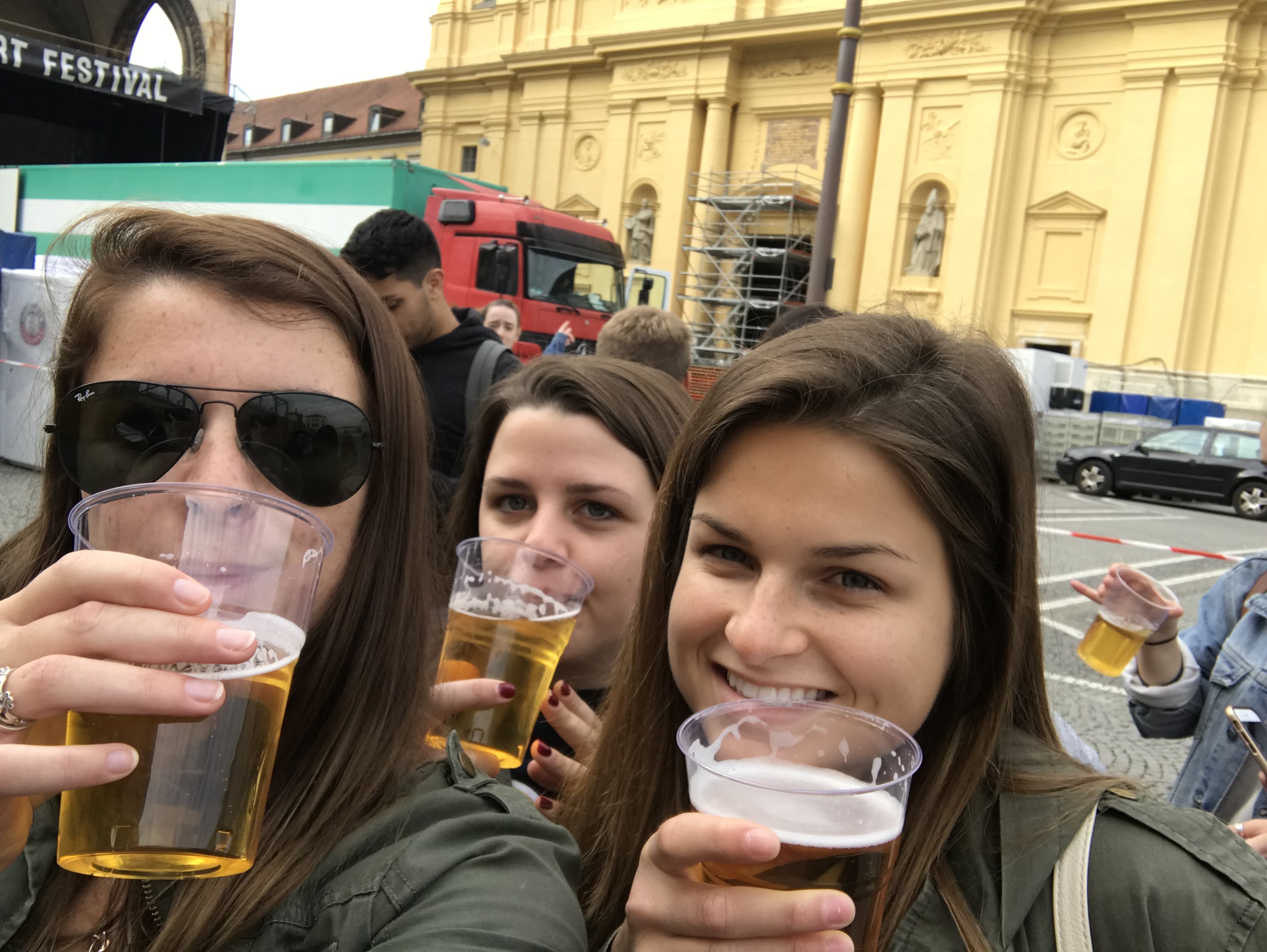 Haley, Steph and I went to Munich this weekend for Oktoberfest. We arrived around 7:30am on Friday by bus and were rushed as soon as we got to the hostel because we had to get to a beer walking tour that started at 9am. In my opinion, the beer walking tour was the best part of the whole weekend. The guide was hilarious and would call out random words during the tour that were indicators of something we had to do and the last person that did it had to finish off their pint of beer. We were walking around the city with a rolling wagon of beer kegs.
