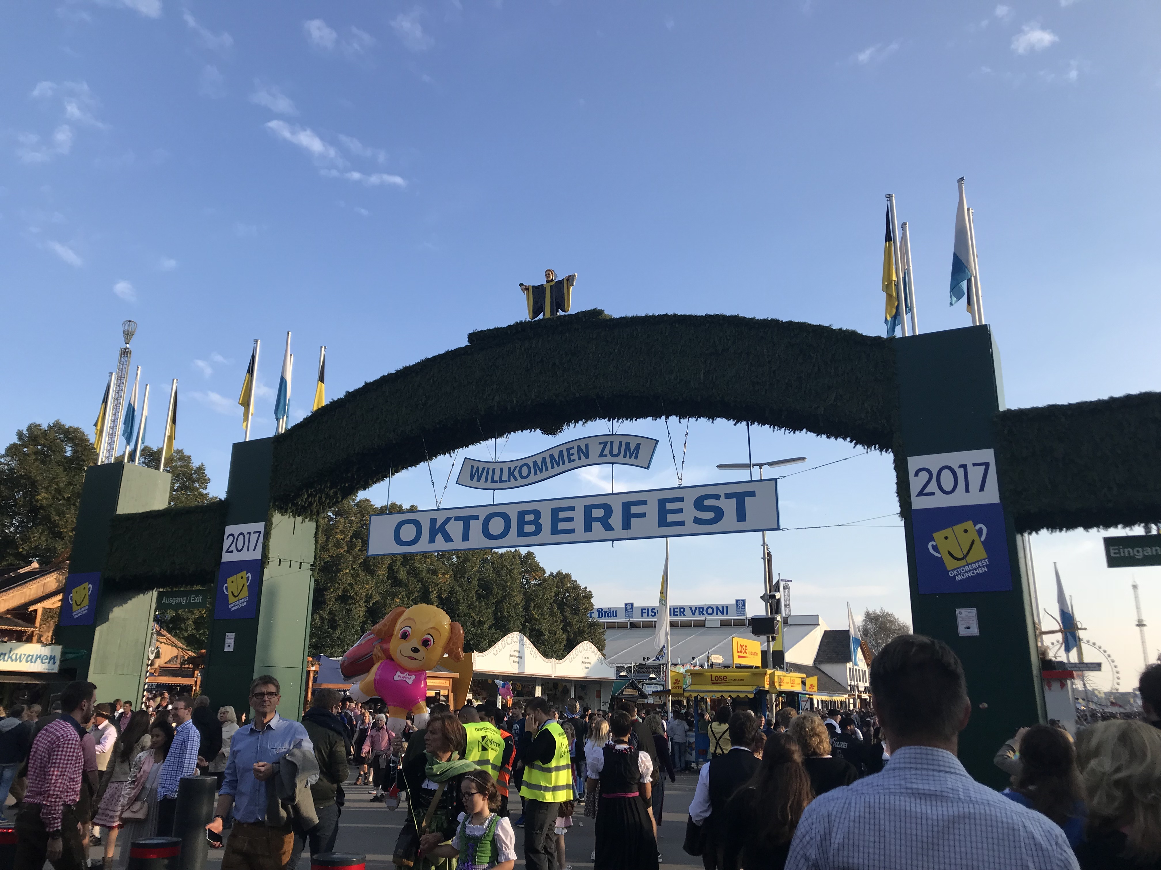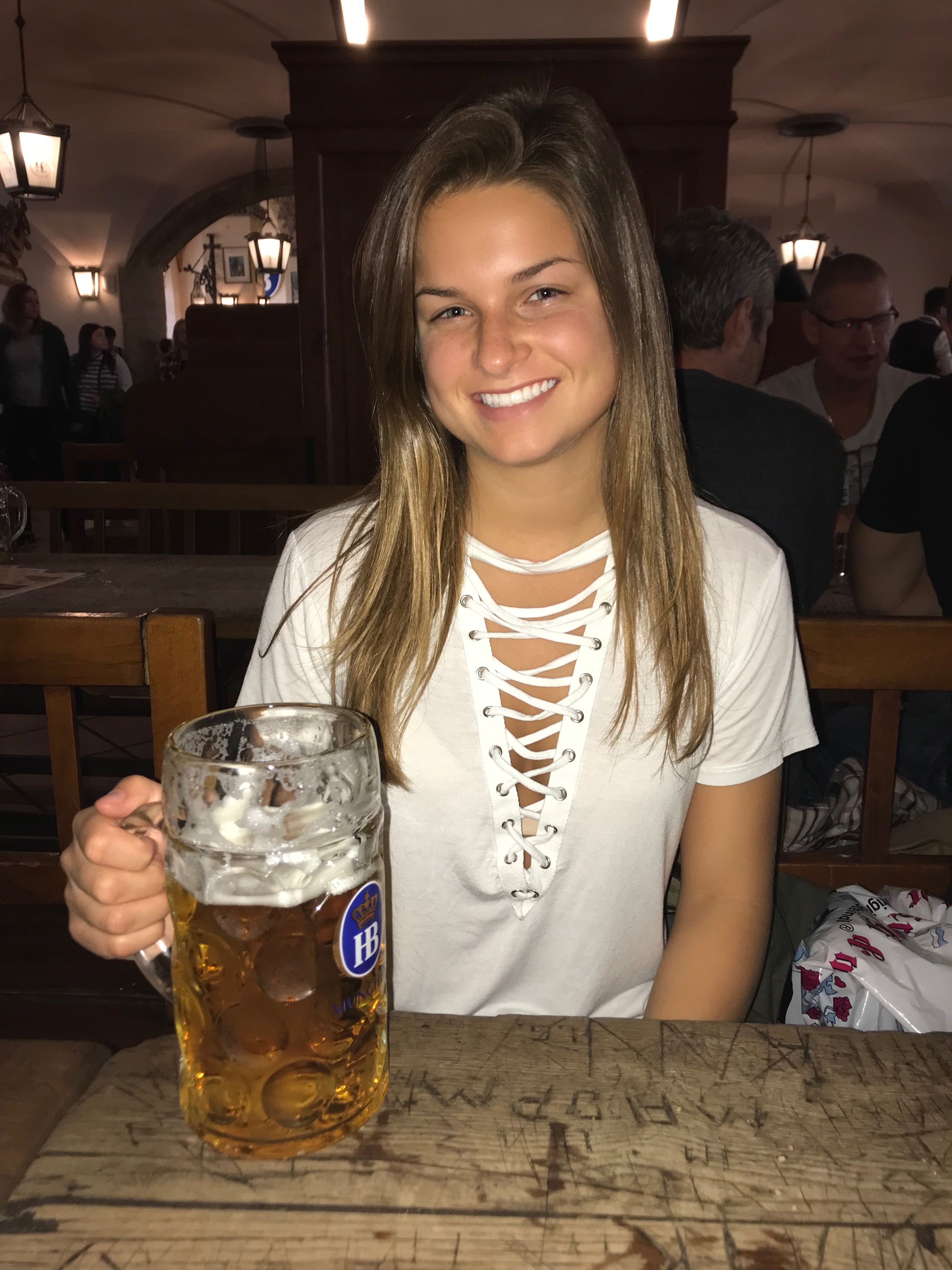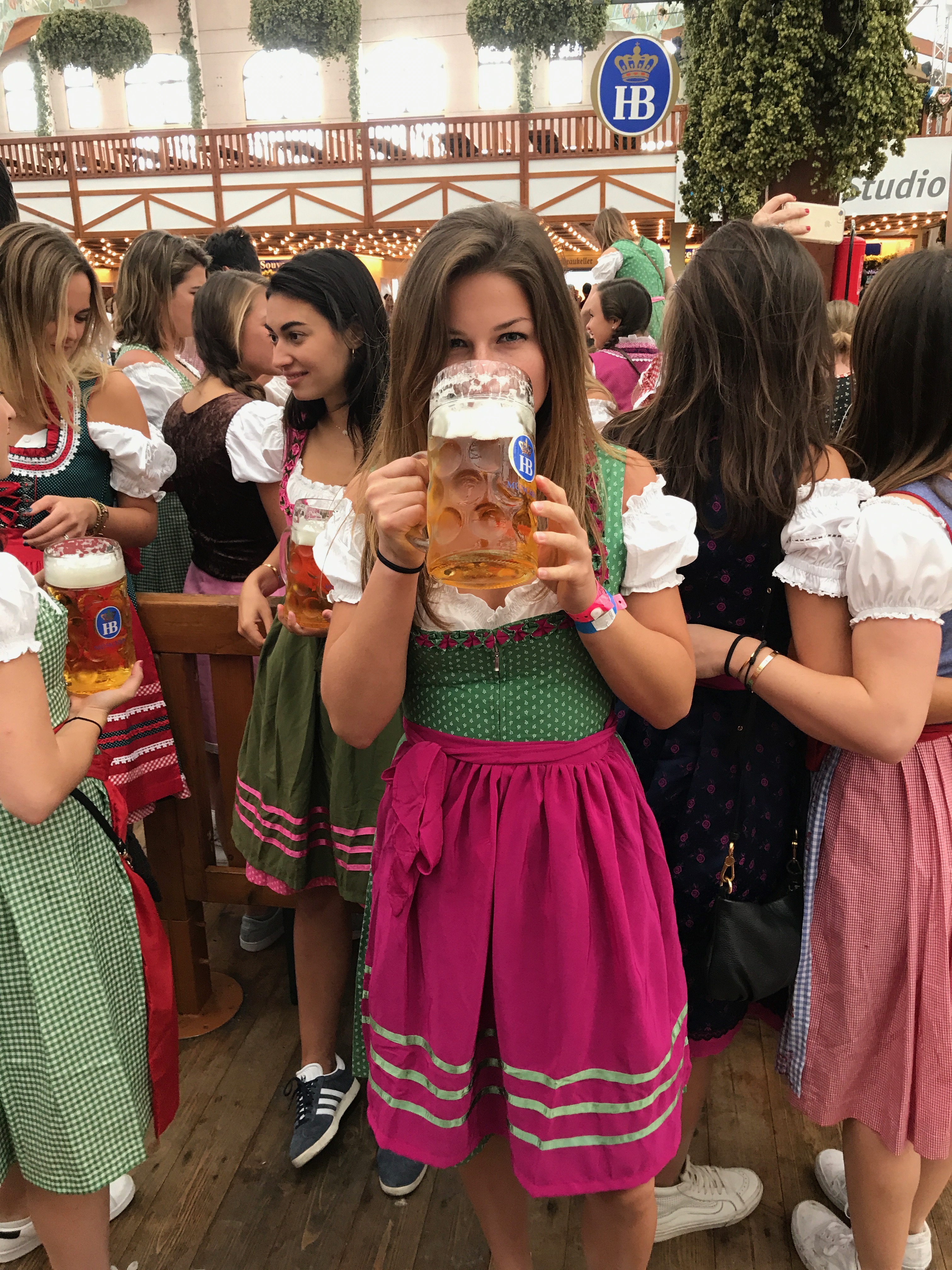 Afterwards we went to buy dirndls for Oktoberfest and then we went to the Hofbrauhaus house for lunch. The food was very different than in Italy. I couldn’t find anything decently healthy on the menu so I just got a salad with chicken but they legit put a drumstick chicken(bone and all) on top of my salad. It wasn’t the best thing I had ever tasted but I also got a liter of beer because…. well, you kind of have to and I wasn’t even able to finish it. For the night we just went to check out Oktoberfest to know what to expect for the next day and it was literally a huge carnival on steroids. It was not what I was expecting. There were so many people, food, rides, beer tents, games, etc. It was crazy. We just went back for the night to get some sleep though because our plan was to get in line at 8am the next morning in order to get a spot in one of the beer tents because Oktoberfest opens at 9am and if you aren’t there in the morning then you can’t find a spot to sit in the tents and sometimes you can even get in the tents.