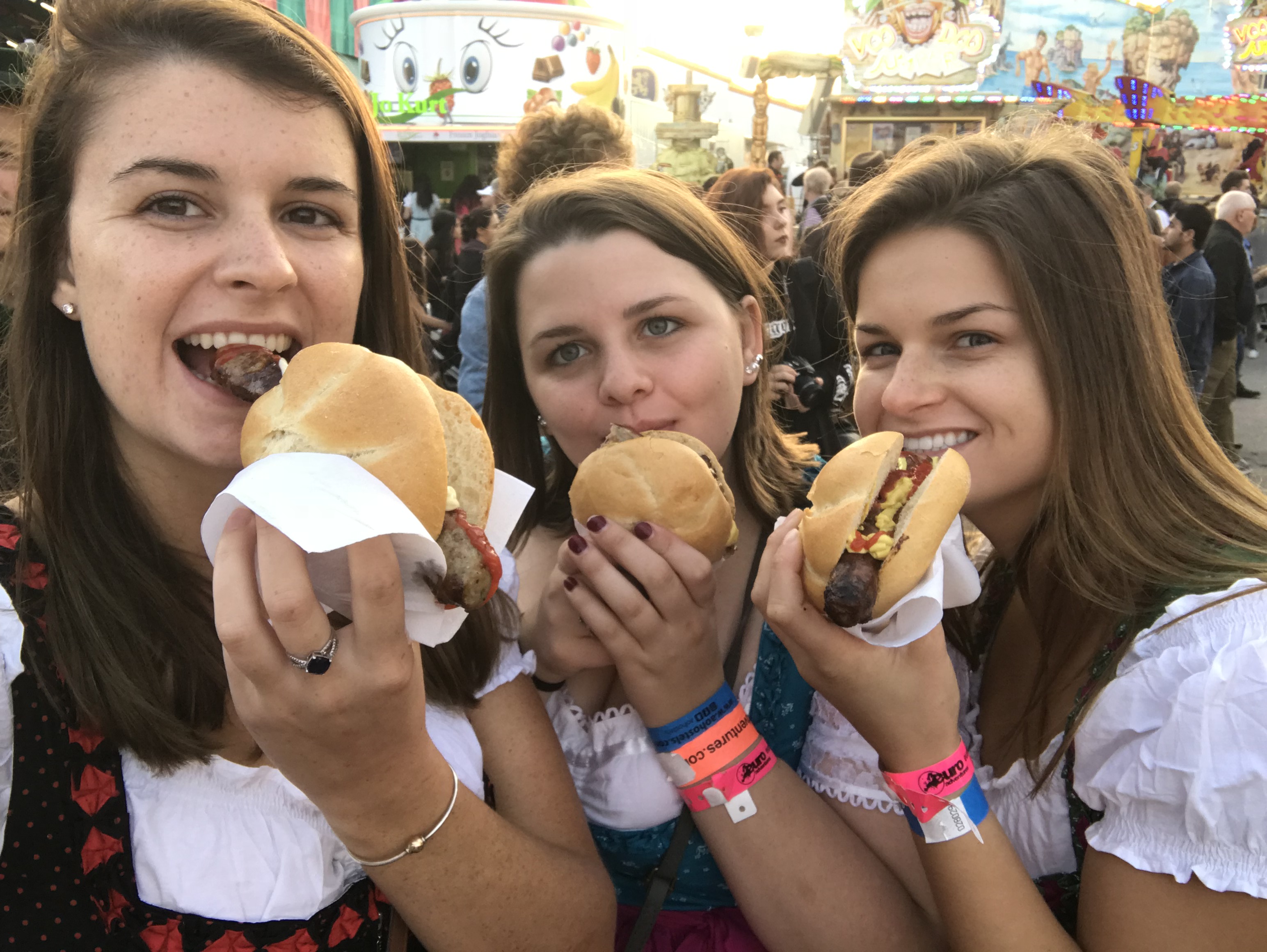 The next morning we did in fact get up early and get in line at 8am. Around 8:45am I was freezing my ass off in my little dirndl and starting to get fed up with standing in line but I held it together because we were so close. When we finally got in and rushed to the Hofbrauhaus tent because we had heard it was the best one for study abroad students, we still could not find any place to sit!!! Luckily a lady came over to us and took our order anyways. All three of us got a liter of beer and surprisingly I finished mine first but only because I was trying to prove to them that I actually can drink beer even though I don’t like it very much. We stayed in this tent for most of the day but I didn’t make it past two beers. I never drink beer so I could just not stomach that much of it. Honestly the whole weekend consisted of lots of beer and bad (meaning unhealthy, but pretty tasty) food, I’m pretty sure my entire body was bloated. Overall Oktoberfest was a decently good time but I think for me I am just not into carnivals and big crowds like that so I wouldn’t go back but I’m happy I got to experience it. On the other hand though, both my room mates had a blast so it really just depends on your personality.